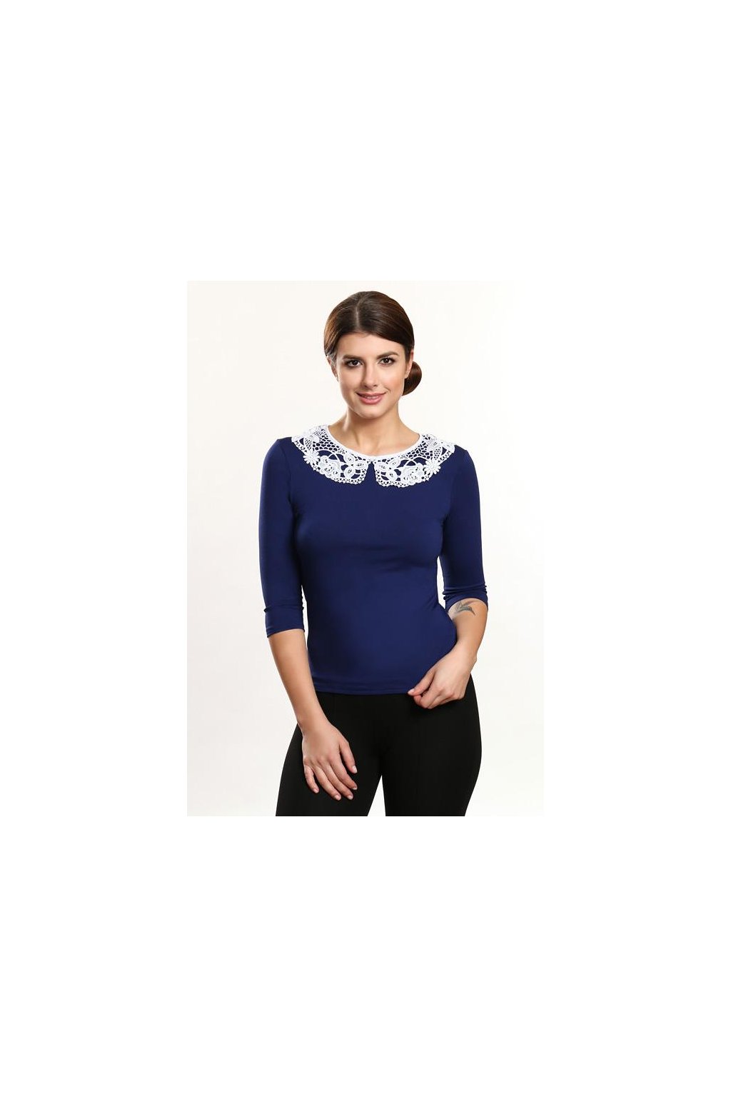 Elegantní dámská halenka Violana Erin black s 3/4 rukávy. Halenka je díky materiálovému složení velice příjemná na tělo. Vhodná do chladnějšího počasí. Halenka je dozdobena květinovým kolárkem. K dostání v barvě tmavě modrá s bílým kolárkem.