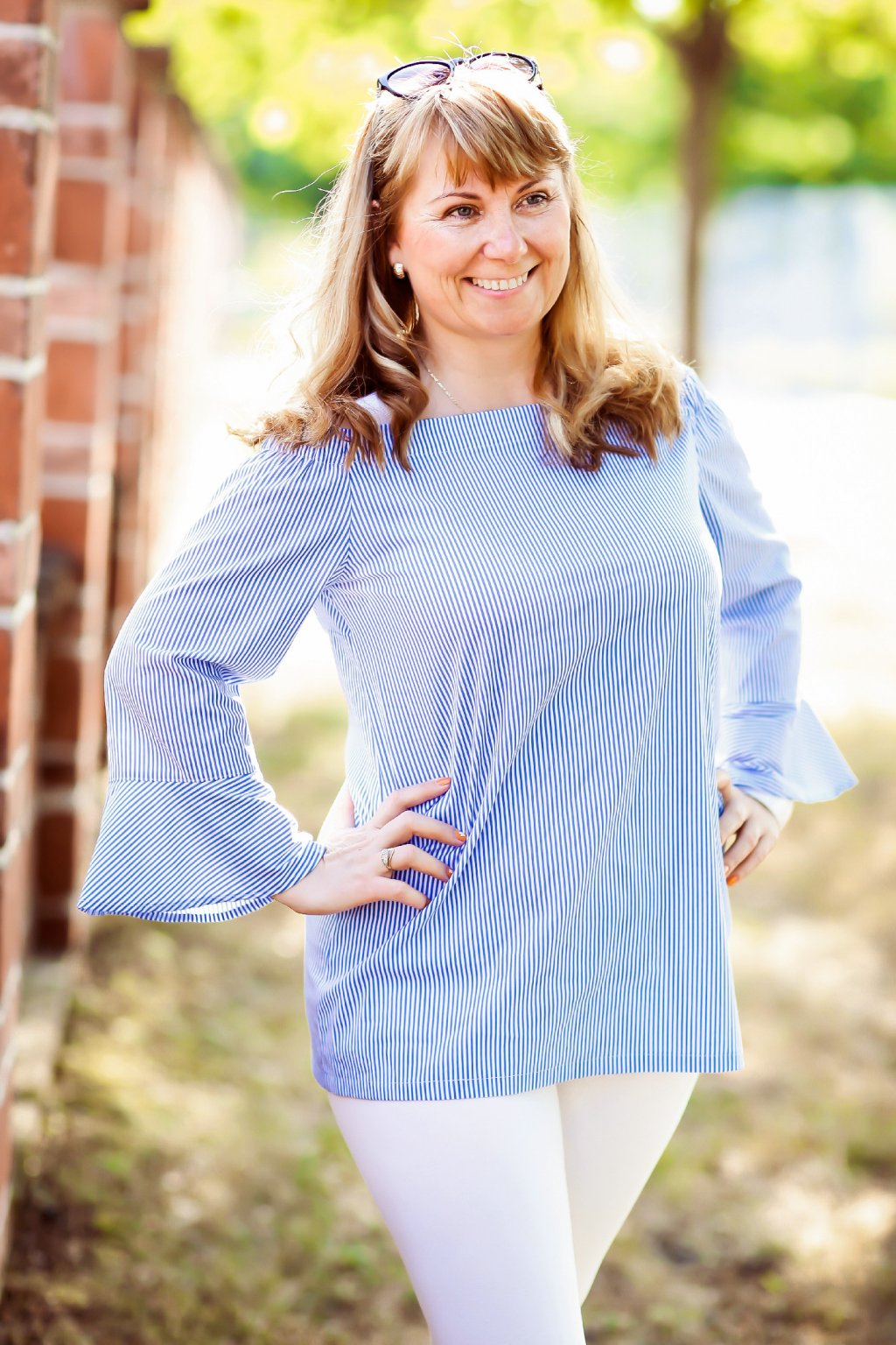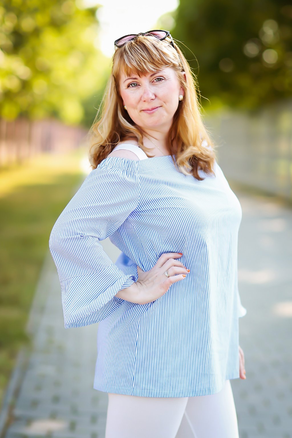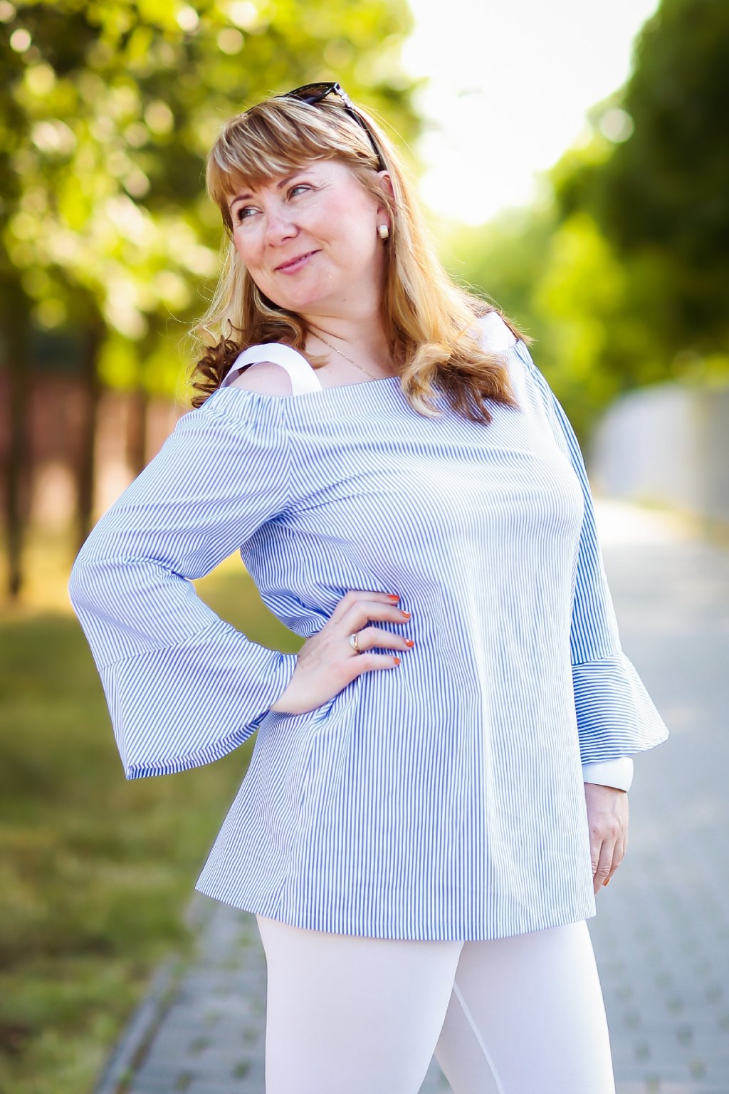 Krásná bleděmodrá tunika s jemným proužkem. Halenku můžeme ušít také jako tuniku s délkou 90 cm. Stačí napsat do objednávky.