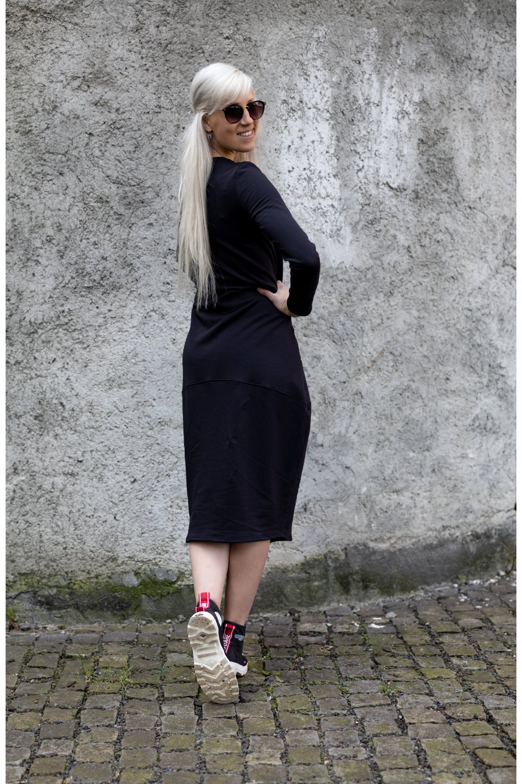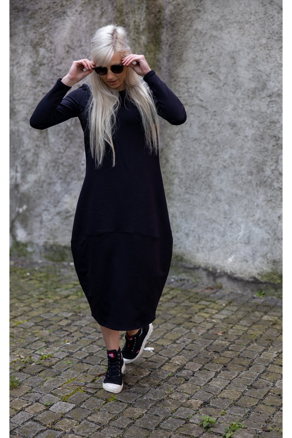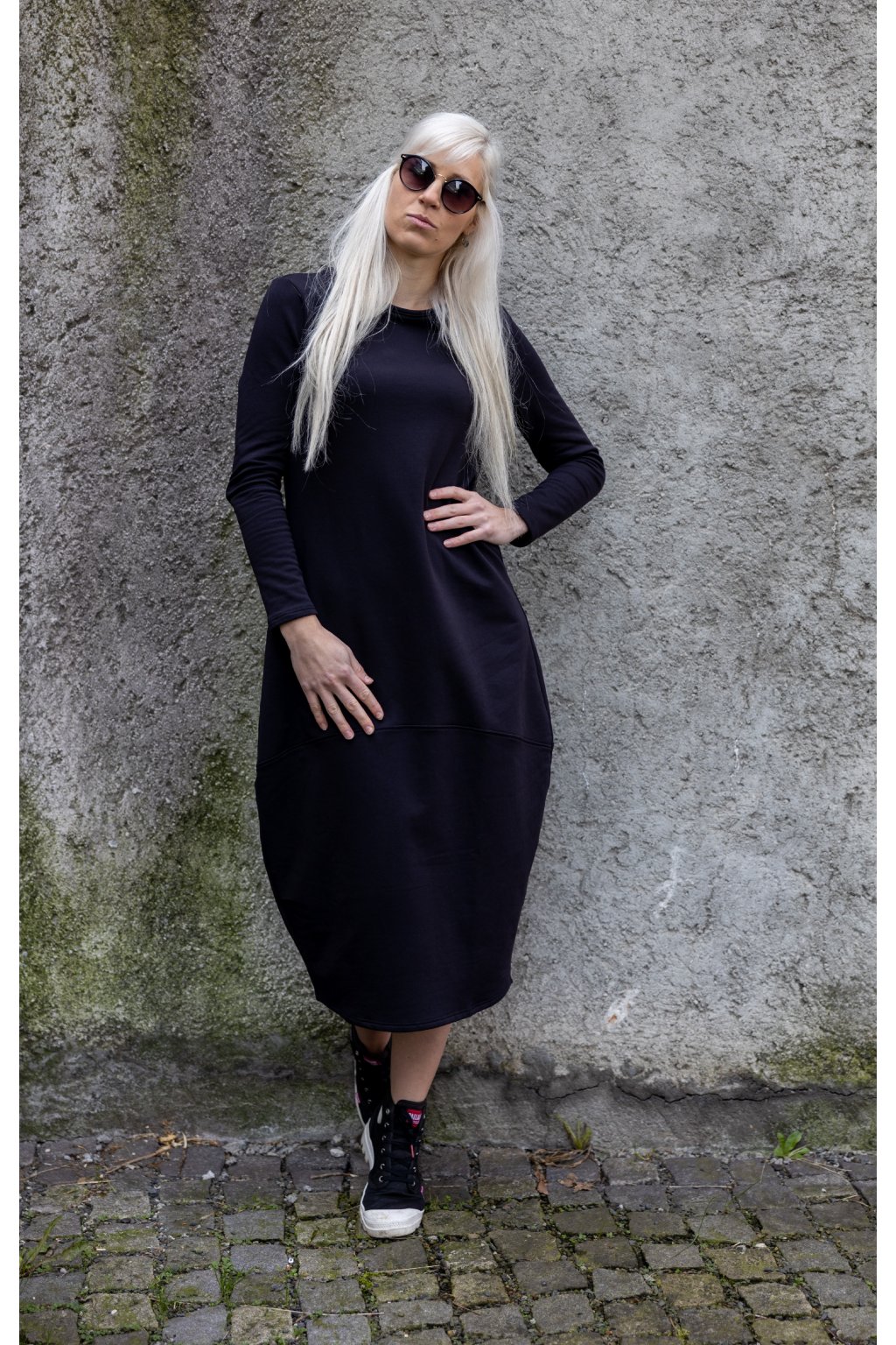 Zajímavé a velmi stylové černé šaty z teplákoviny volnějšího střihu ve spodní části. Jsou určeny pro každodenní nošení. Hledají k sobě ženu, která je vytáhne na procházku se svými kamarádkami nebo do práce.