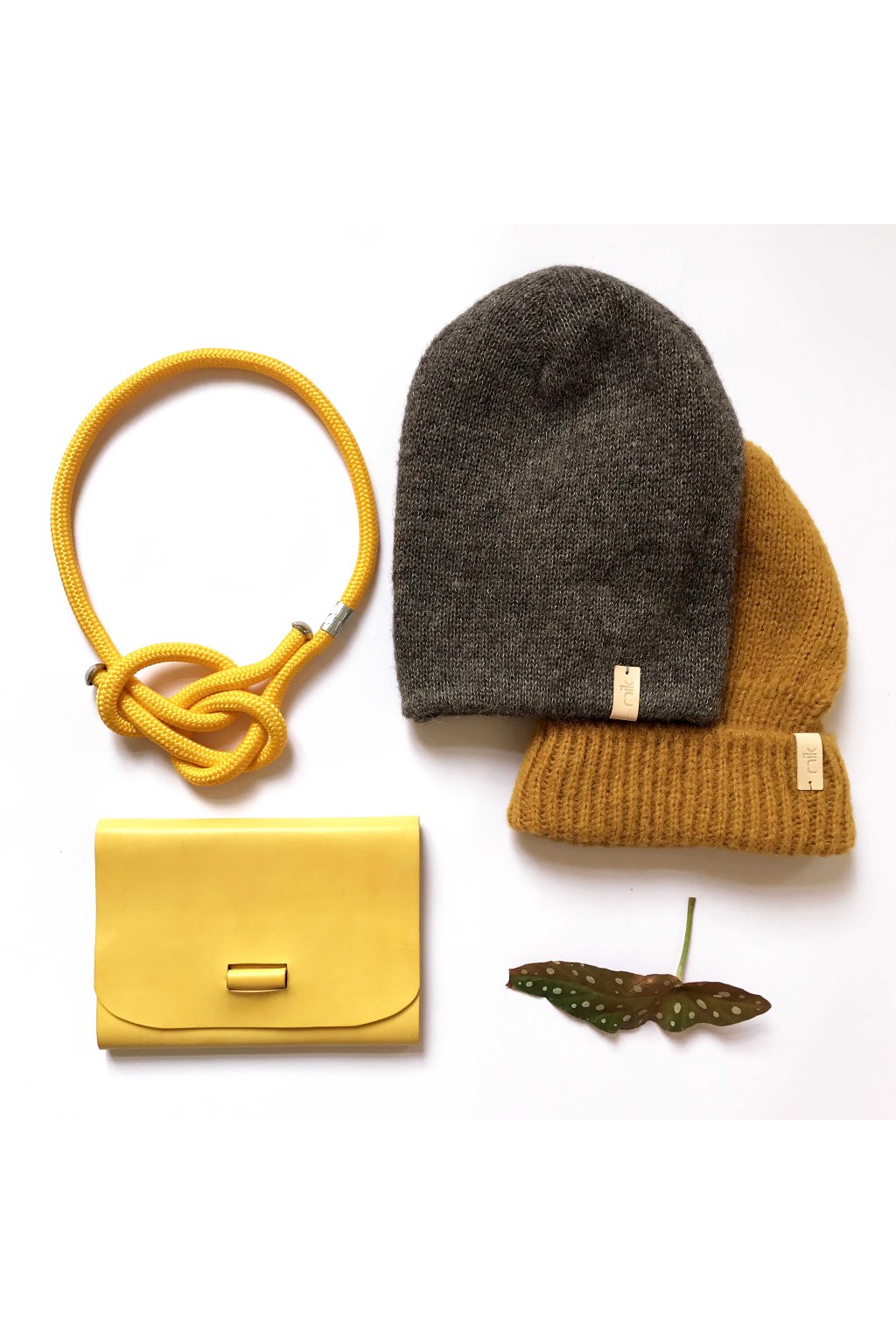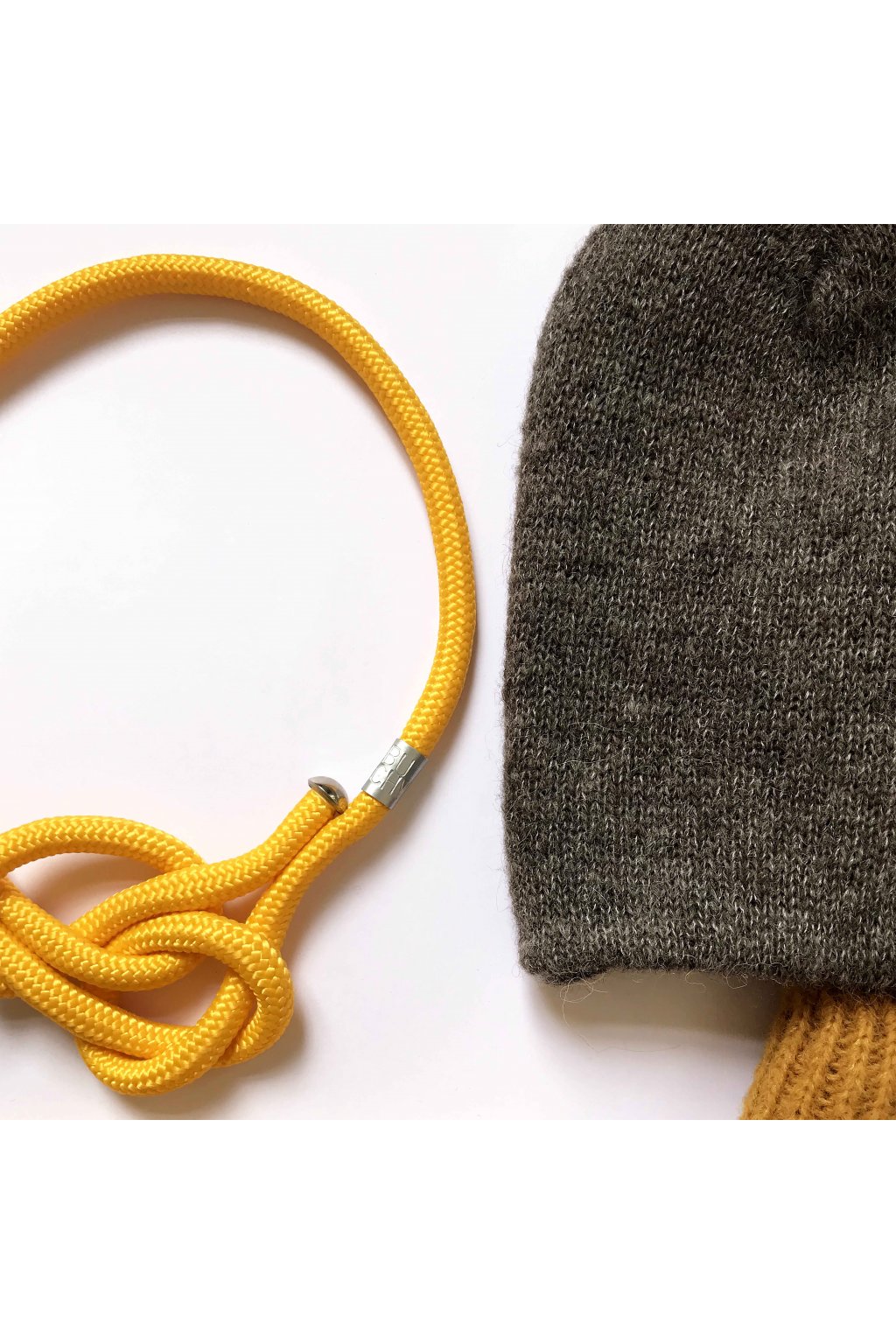 Proplétaný žlutý náhrdelník. Náhrdelník je ručně vyroben z kvalitních českých materiálů, doplněný o signifikantní hliníkový prvek s logem BUCHY.