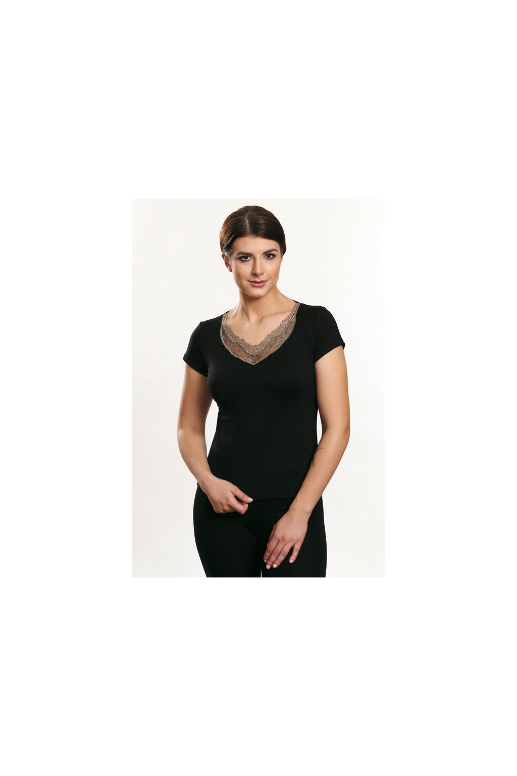 Luxusní dámská halenka Violana Iga s krátkým rukávem v černé barvě. Dekolt této halenky je zdoben slušivou krajkou ve zlaté barvě a jemnou černou síťkou. Tato halenka je vyrobena z velmi kvalitního materiálu a perfektně se přizpůsobí Vašemu tělu.