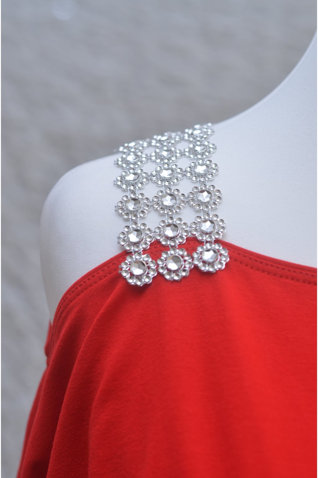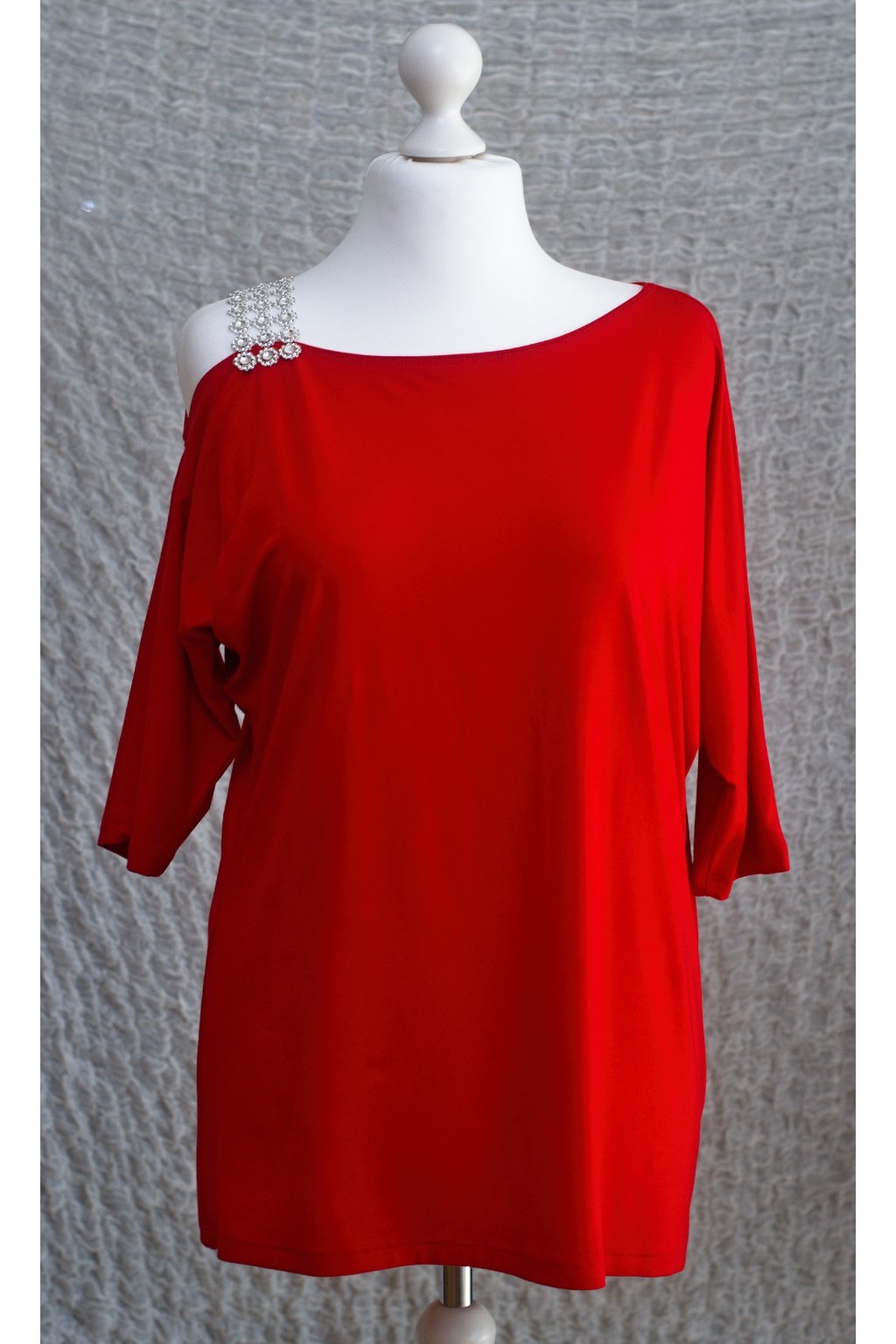 Skvělá multifunkční červená halenka s 3/4 rukávy a jedním ramínkem. Celý den se k Tobě bude oddaně tisknout, tak, aby na první pohled zeštíhlila celou Tvou siluetu. Uchvátí Vás právě tím, jak je pohodlná. Krásně pruží, díky elastanu ve složení. Díky svému složení je velmi příjemná na nošení. Rukávky mají netopýří nádech. Halenka nabízí vysoké pohodlí.