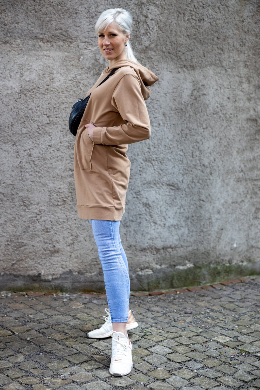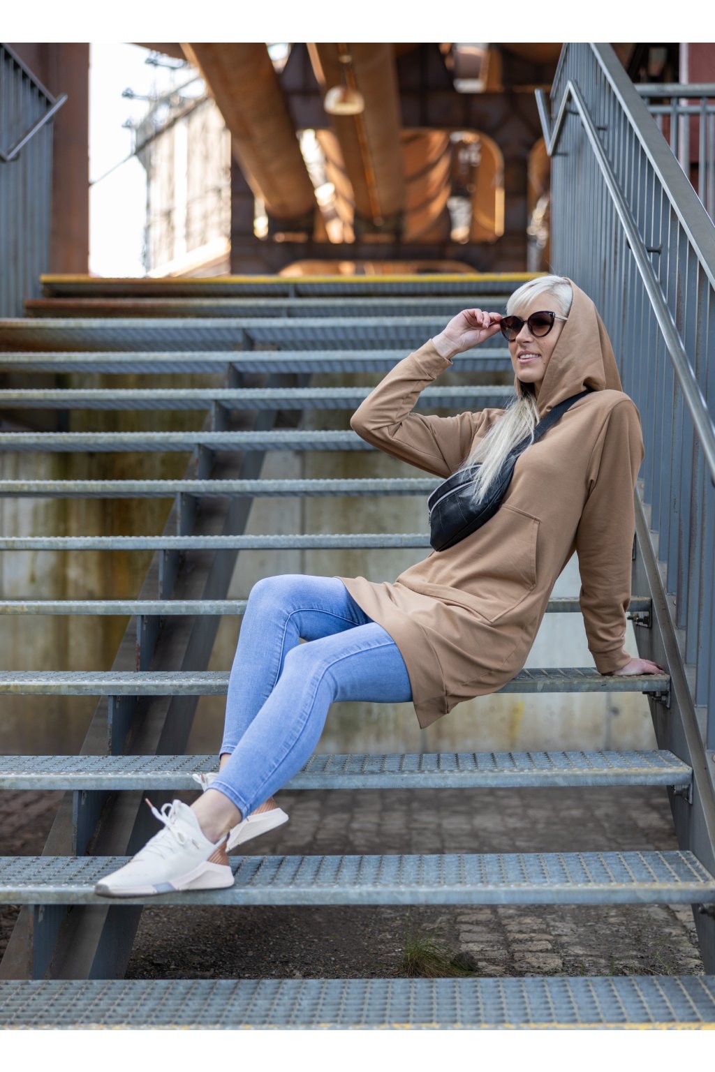 Sportovní a velmi pohodlné mikinošaty. Mají super střih, vycházející z prodloužené mikiny, s klokaní kapsou, dlouhým rukávem a volnou kapucí. Má praktickou větší klokaní kapsu. V délce mikiny i rukávů je zapravena do manžety ze stejného materiálu, takže i jako šaty má sportovní a mladistvý charakter.